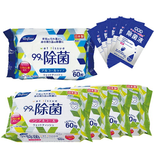 【あす楽対応】【除菌ウェットティッシュ】リファイン アルコール除菌 ウェットティッシュ LD-108 (60枚入り) + リファイン除菌ウェットティッシュ LD-109 (60枚入り) ノンアルコール×4個 + マイン携帯用アルコール配合 除菌液(2mL)×5個セット - 無香料。日本製。